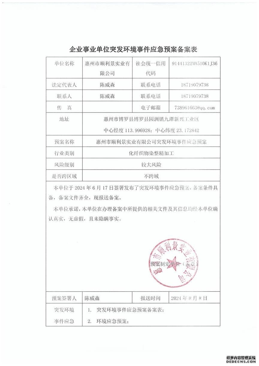 已制訂《惠州市順利景實業(yè)有限公司環(huán)境風險評估報告》,并于2024年8月9日上報博羅縣環(huán)境保護局備案; |