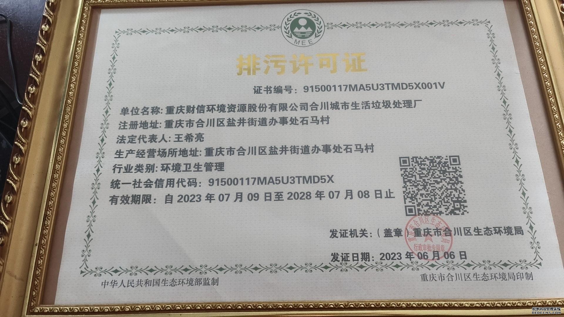 附件:重慶財信環(huán)境資源股份有限公司合川城市生活垃圾處理廠排污許可證掃描件